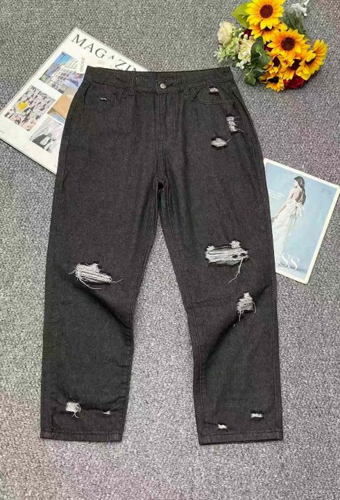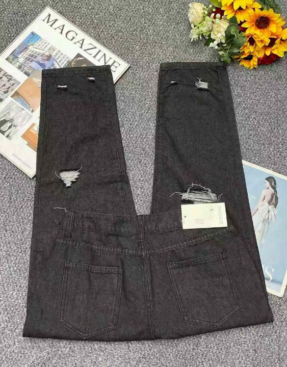 春夏季新款复古美式宽松大码女装破洞设计款牛仔老爹哈...