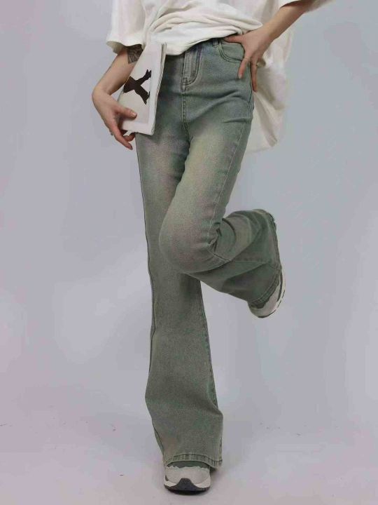 水洗黄泥染微喇叭牛仔裤女秋冬新款高腰显瘦辣妹40件,...