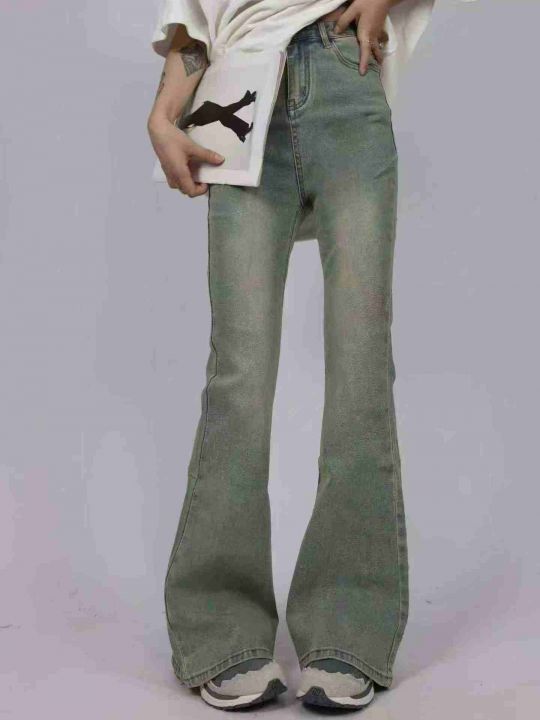 水洗黄泥染微喇叭牛仔裤女秋冬新款高腰显瘦辣妹40件,...