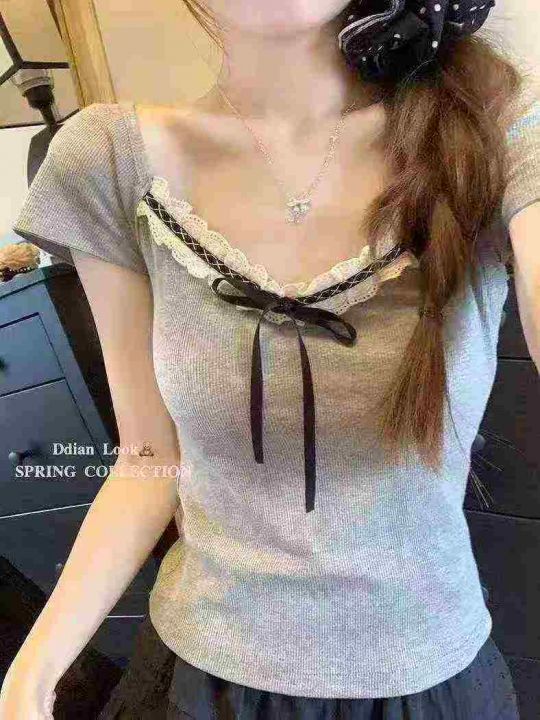 法式蕾丝拼接短袖499件6.5,面料柔软有弹力,蝴蝶结蕾丝花边,码数1-4码(S...