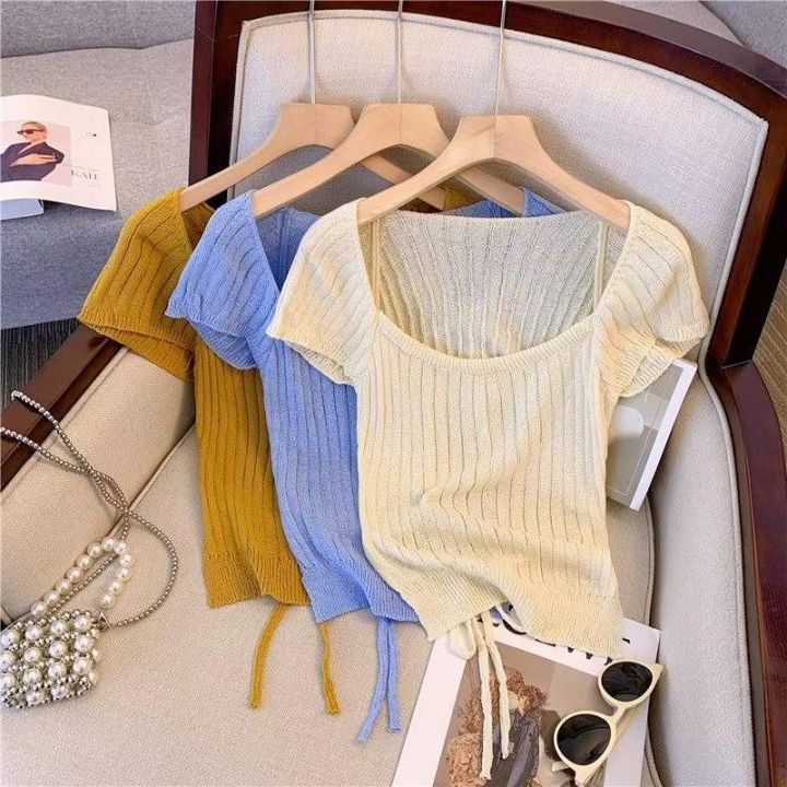 夏季新款绑带设计款冰丝网红针织T桖,独立包装,均码...