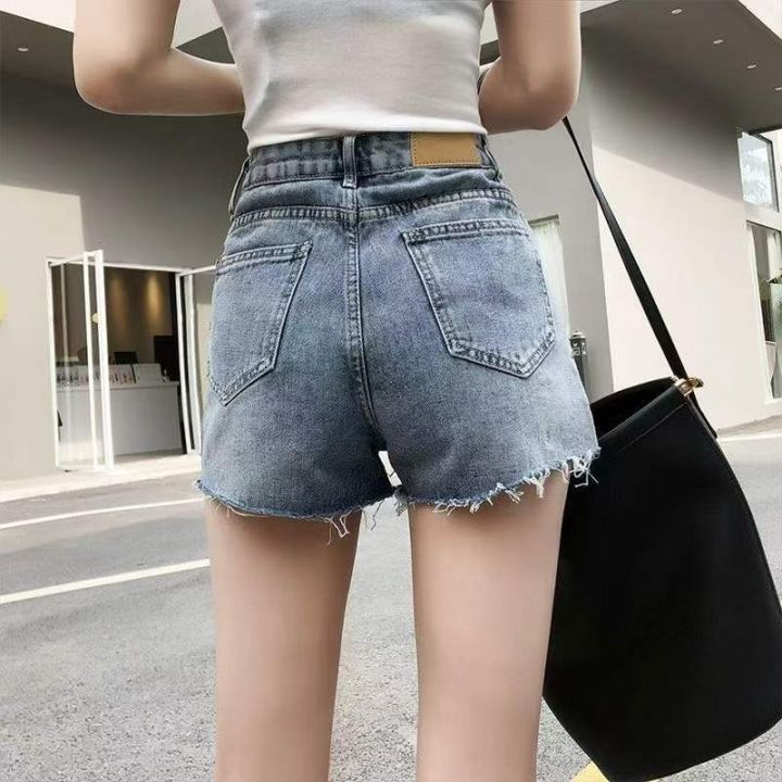 夏季新款洗水棉网红复古毛边浅蓝色阔腿水洗A字高腰牛仔短裤,独立包装带腰...