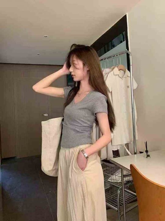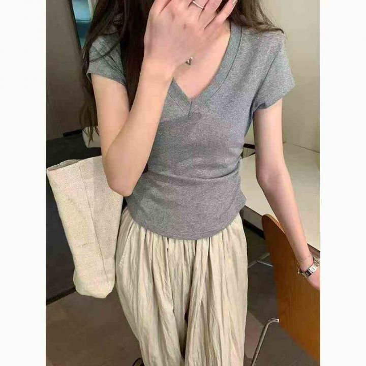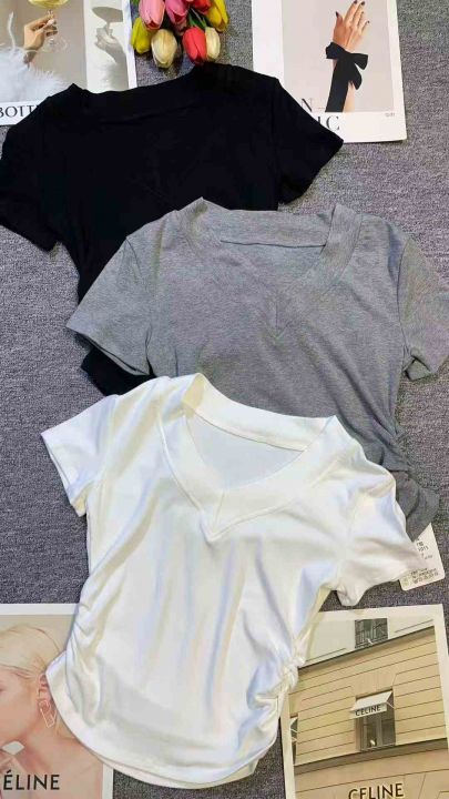 韩版v领纯色正肩褶皱收腰设计感辣妹T恤,[爱心]195件左右,两个款,款号#1011#25044,码数S-XL,穿70-120斤,万佳档口货,原包装️无瑕疵,[666]实体店品质,分货加一