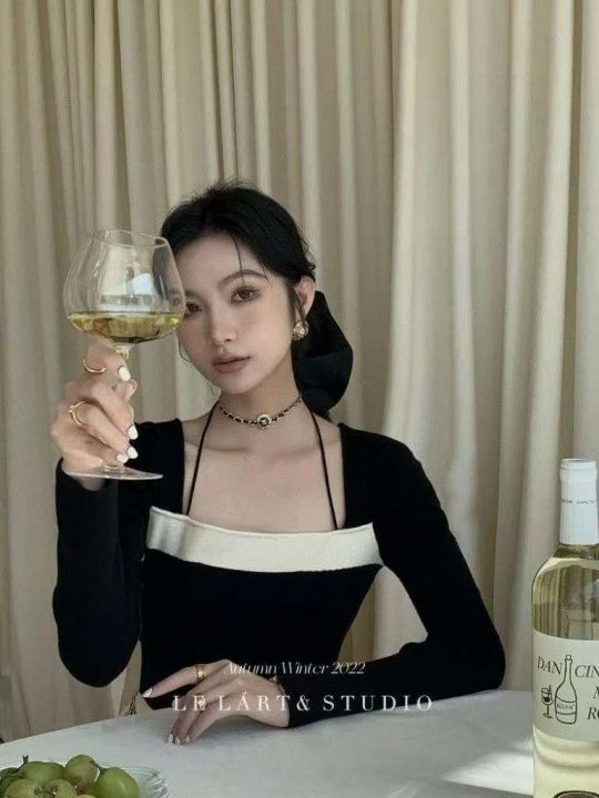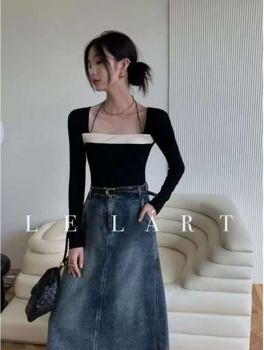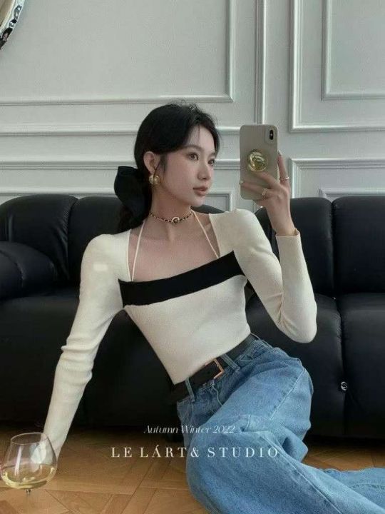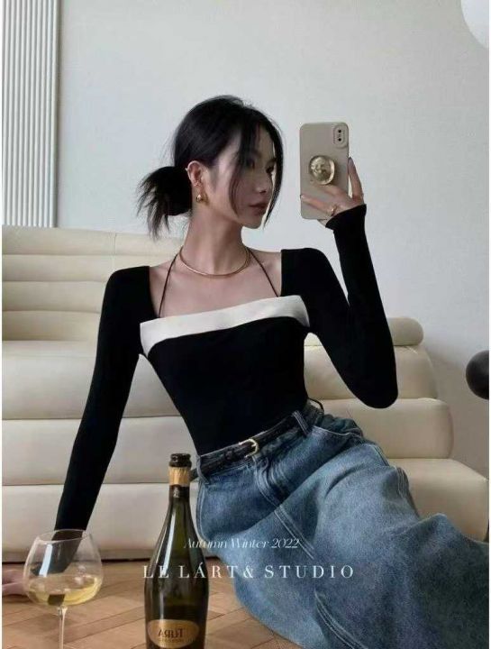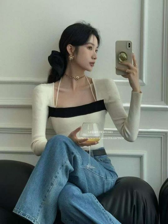 性感纯欲方领长袖针织衫设计短款显瘦打底针织上衣,独...