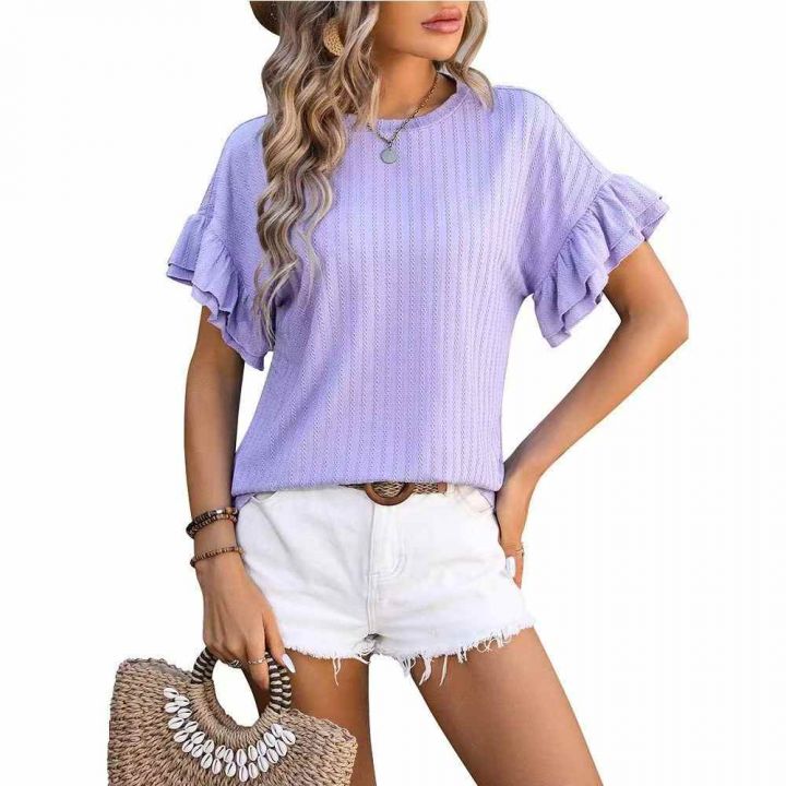 春夏新款纯色圆领荷叶袖短袖T恤上衣,数量26件,码数M-2XL,独立包装,5.8...