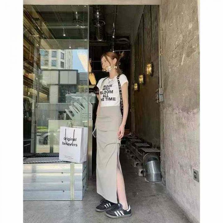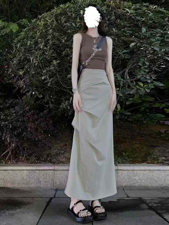 美式欧美工装半身长裙女春夏辣妹褶皱高腰显瘦开叉包臀...