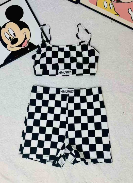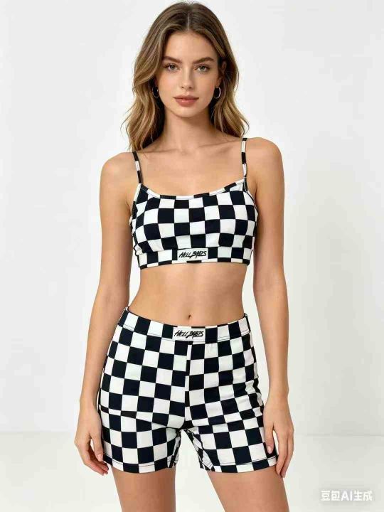 295套美式黑白棋盘格辣妹吊带短裤两件套瑜伽健身运动...