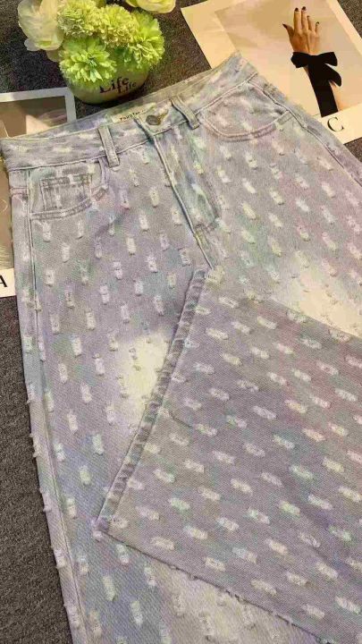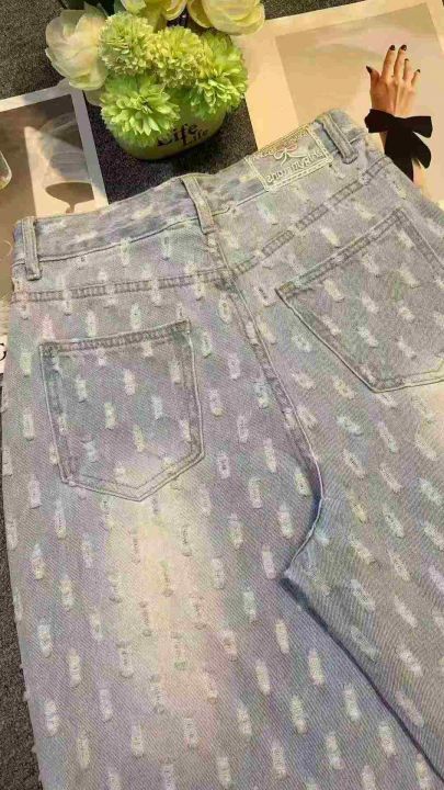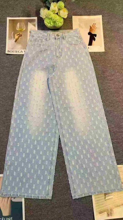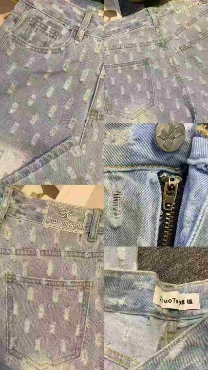韩版破洞设计感宽松直筒牛仔裤,[爱心]85件左右,单款单色,S码腰围68裤长106,码数S-L,穿70-130斤,广州十三行货,原包装️无瑕疵,[666]实体店品质,(模特图仅供参考)