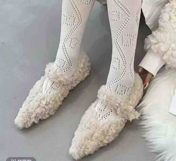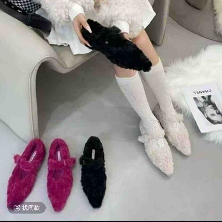 潮牌平底尖头玛丽珍毛毛鞋,秋冬外穿,温柔系,浅口一...