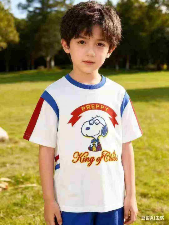 品牌童装个性logo短袖T恤,数量1000件左右,码数110--160,整款两个品牌(史努比、大嘴猴) 可分品牌出,后领包边,货品整洁质佳