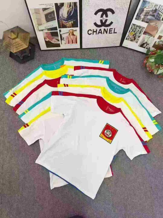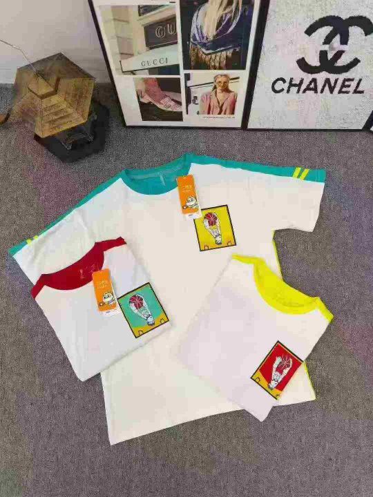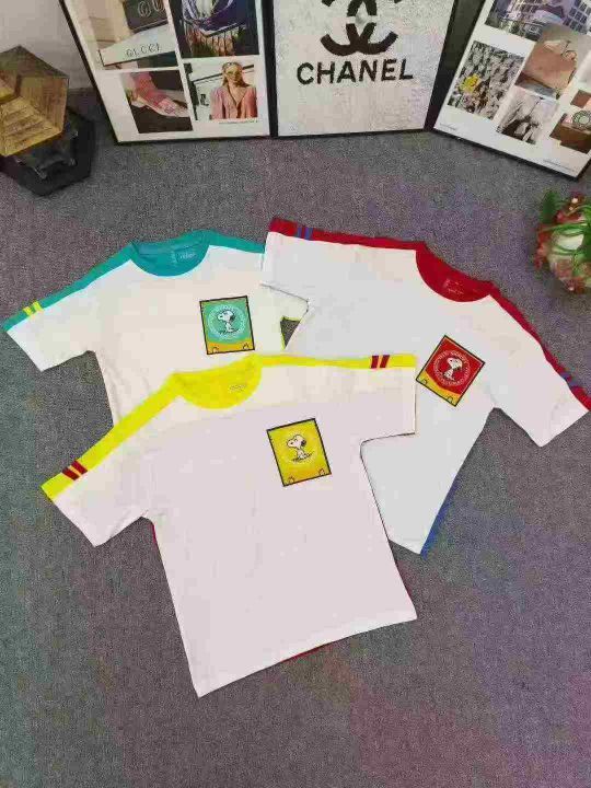 品牌童装拼色T恤 数量2200件左右 尺码110--160 整款三个色 后领包边 面料图7 可分品牌出, 独立包装带吊牌 大货干净整齐
