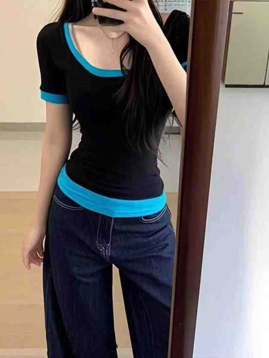 [月亮]:辣妹U领垂感拼色设计假两件T恤