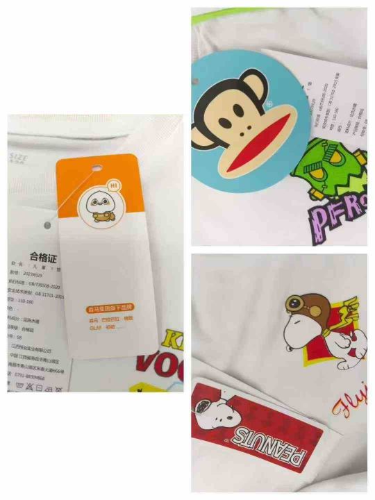 品牌童裝拼袖夏装T恤,数量5000件左右,尺码110--160,整款三个色,三个品牌(史努比、大嘴猴、森马) 可分品牌出,后领包边,独立包装带吊牌,大货干净整洁