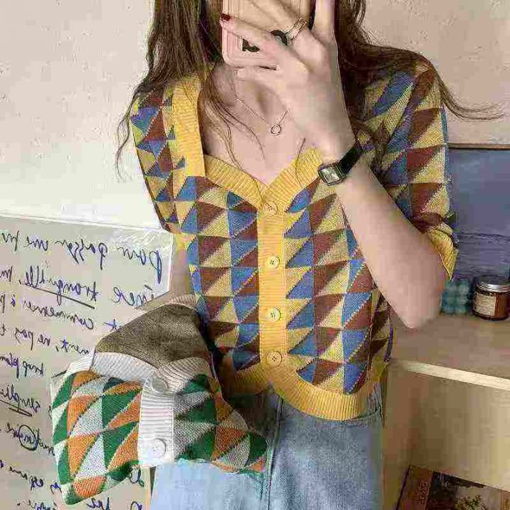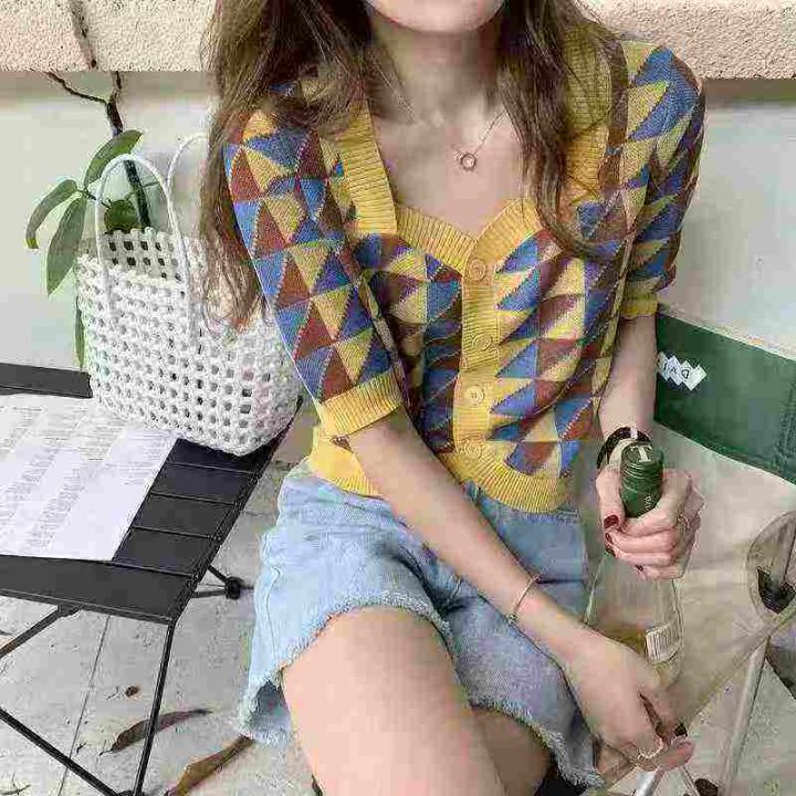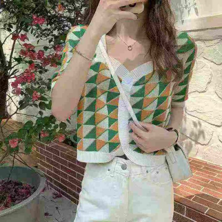 夏季韩版ins方领复古格子拼色针织开衫女显瘦洋气短袖...