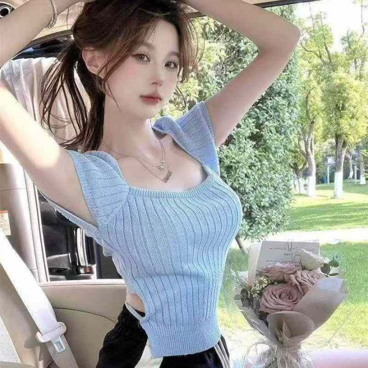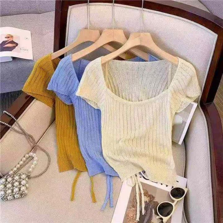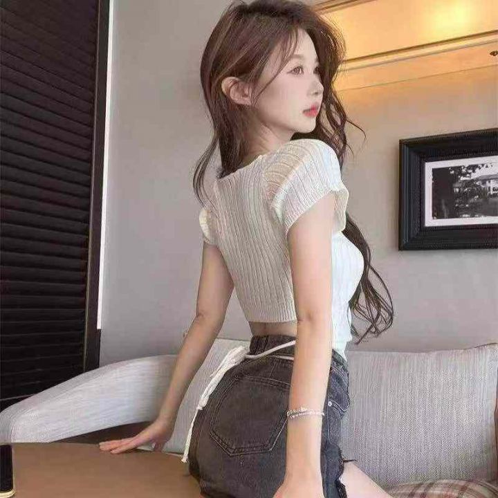 夏季新款绑带设计款冰丝网红针织T桖,独立包装,均码...