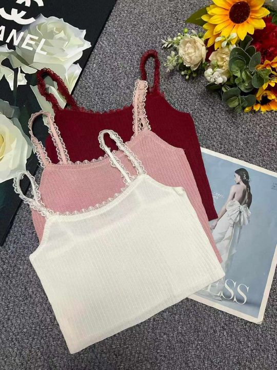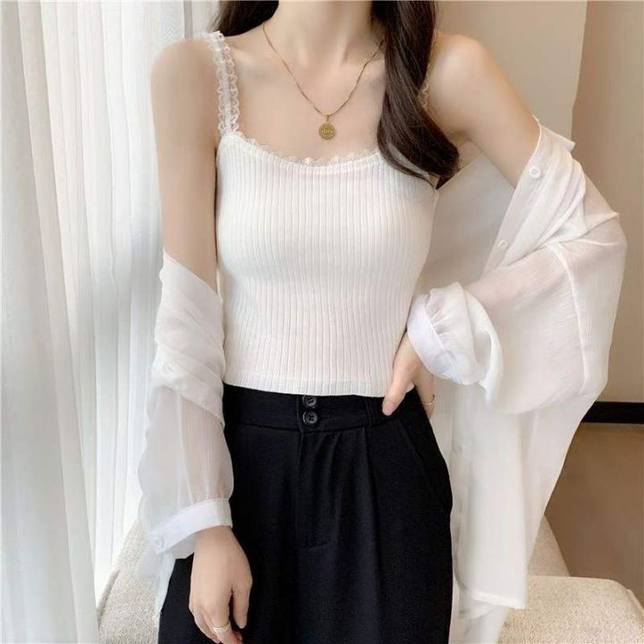 夏季新款纯欲奶甜法式别致甜辣蕾丝拼接针织吊带背心,...