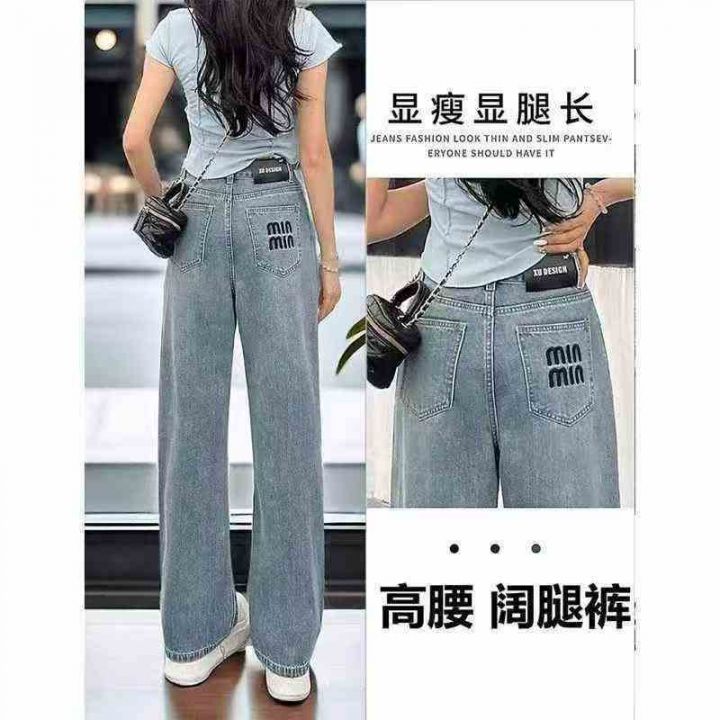 网红款简约复古刺绣直筒牛仔裤女高腰宽松显瘦拖地阔腿裤,单款单色,独立包...