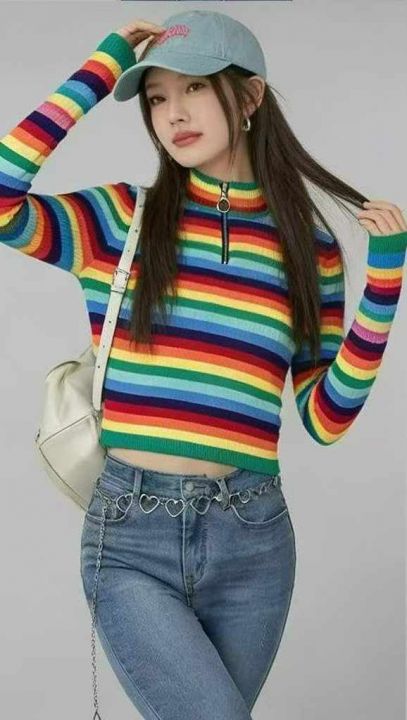 春秋新款高弹舒适半拉链条纹针织套头毛衣,独立包装,...