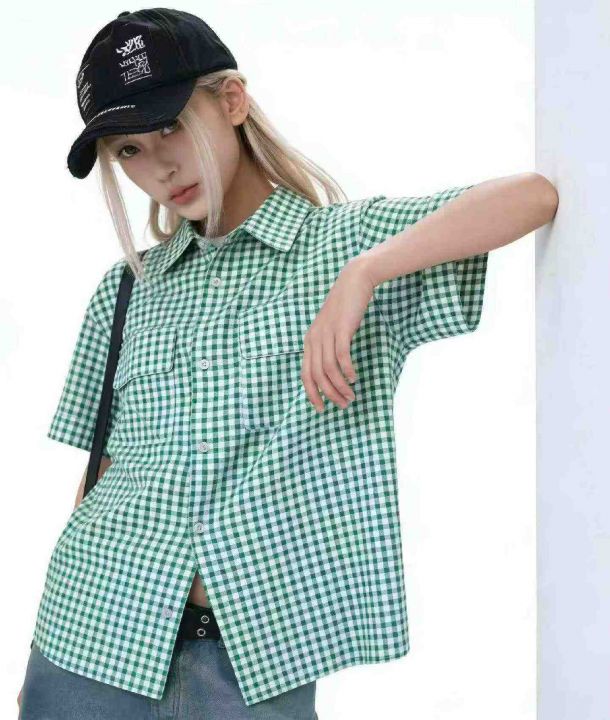 夏季新款宽松韩版百搭设计感小众清新格子衬衫,独立包...
