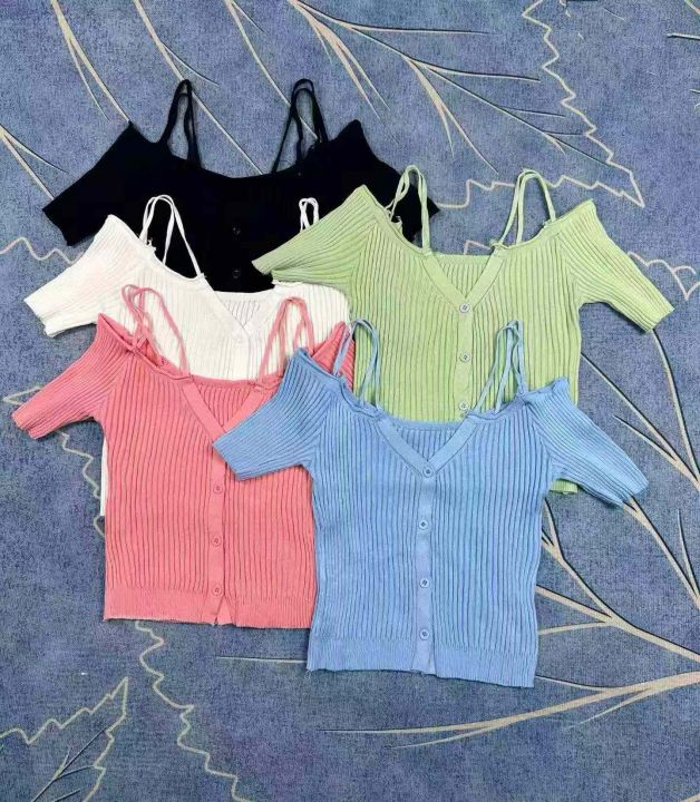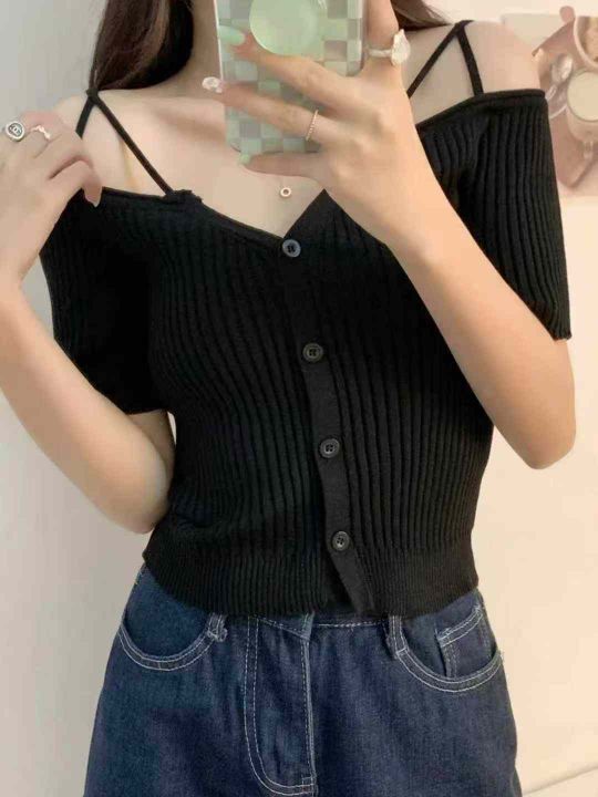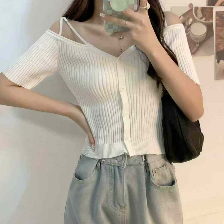 法式一字肩v领短袖夏纯欲冰丝针织吊带露肩短款冰丝上衣,独立包装,340件,清5.8,分➕0.5