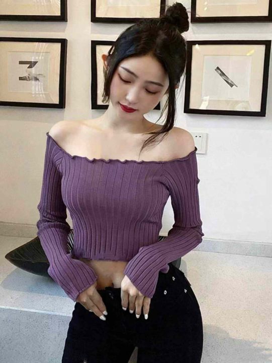 一字领露肚脐长袖内搭春秋修身短款针织上衣,独立包装...