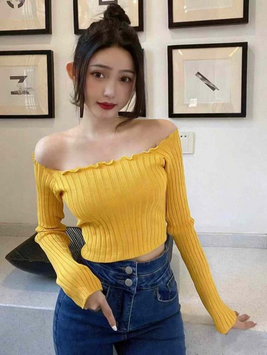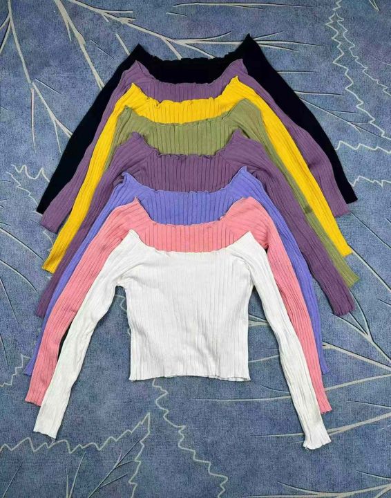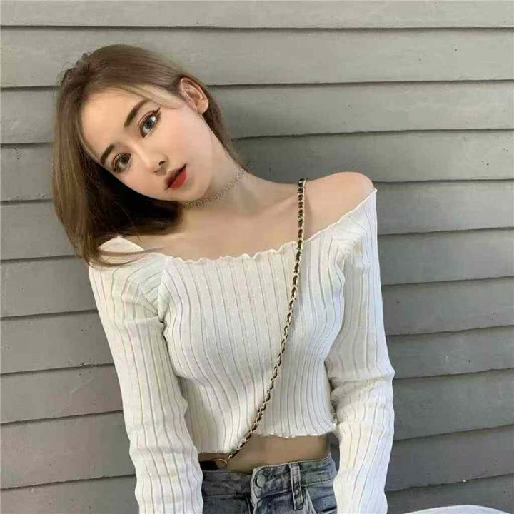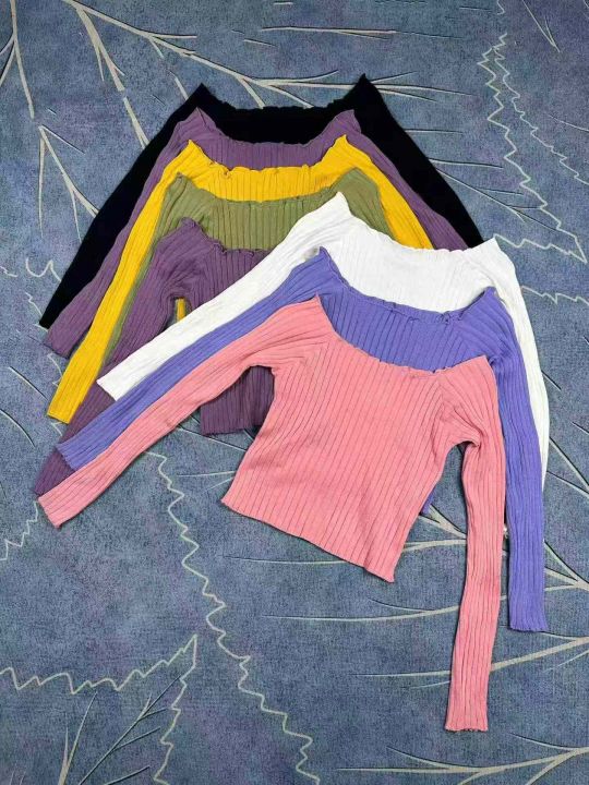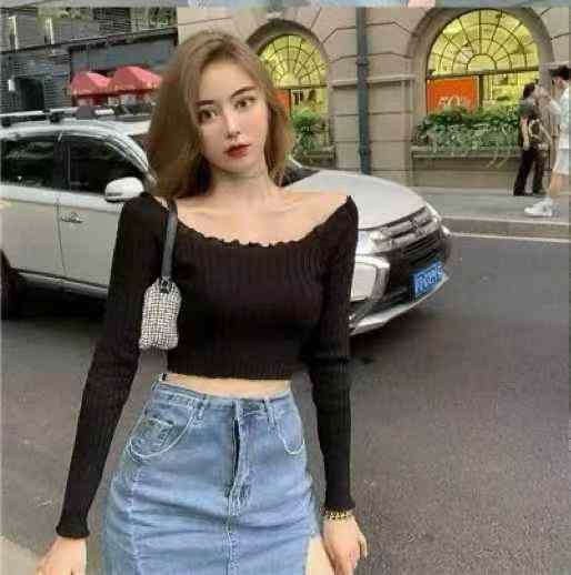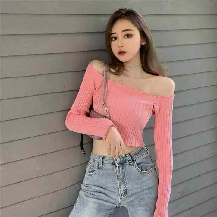 一字领露肚脐长袖内搭春秋修身短款针织上衣,独立包装,750件左右,清6.8