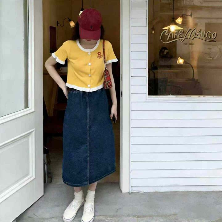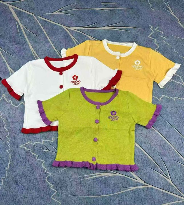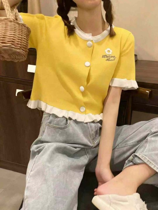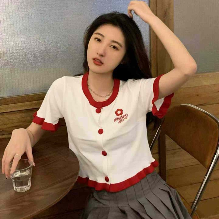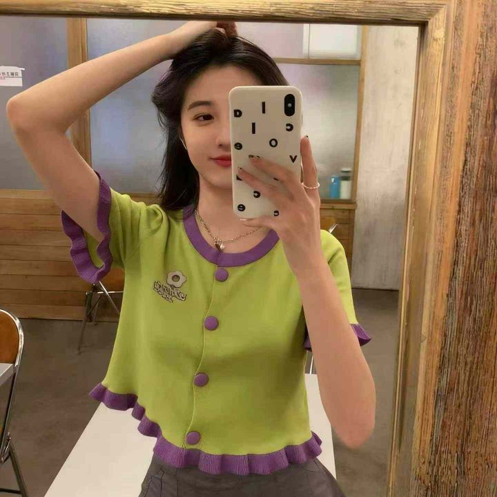 复古撞色刺绣木耳边短袖针织衫外搭开衫女夏季薄款修身短款上衣潮,独立包装,300件左右,清7.8,分➕1