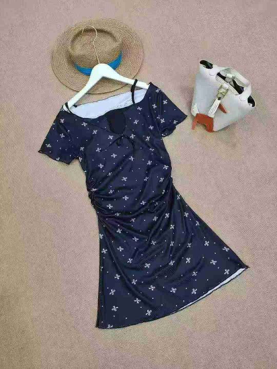 [月亮]:气质蕾丝边蝴蝶结印花假两件连衣裙