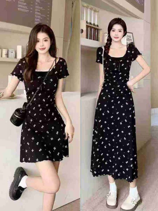 [月亮]:气质蕾丝边蝴蝶结印花假两件连衣裙