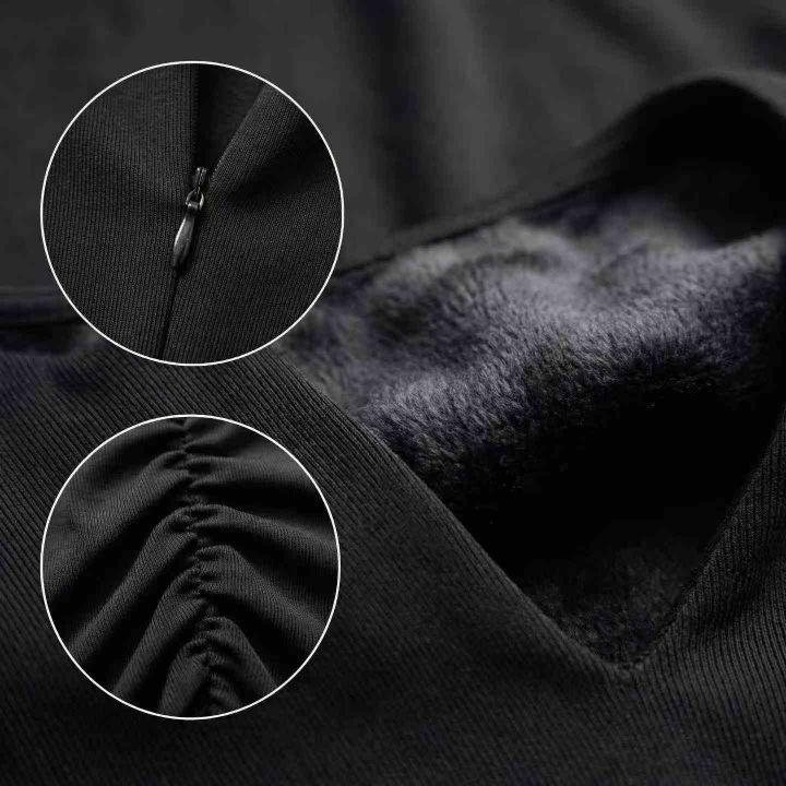 高品质女装整款加绒连衣裙 黑色V领侧打揽修身包臀裙 加绒显瘦长袖紧身辣妹包臀气质连衣裙