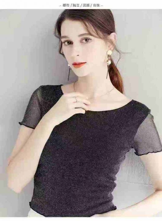 285件短款木耳边网纱打底衫女短袖内搭纱衣圆领新款亮...