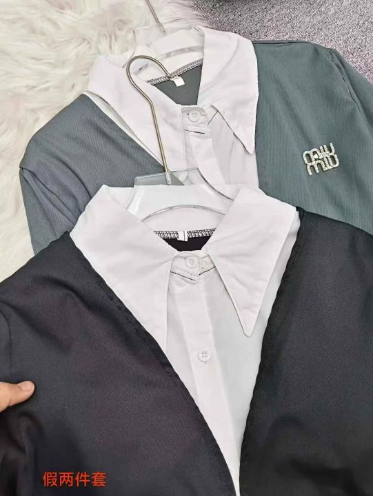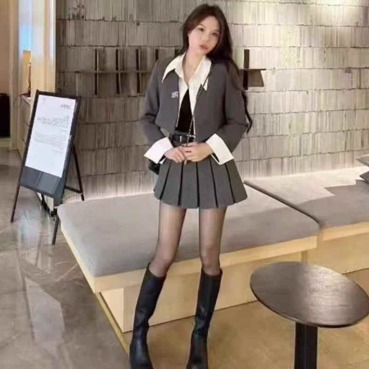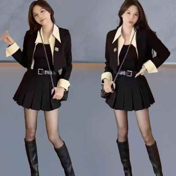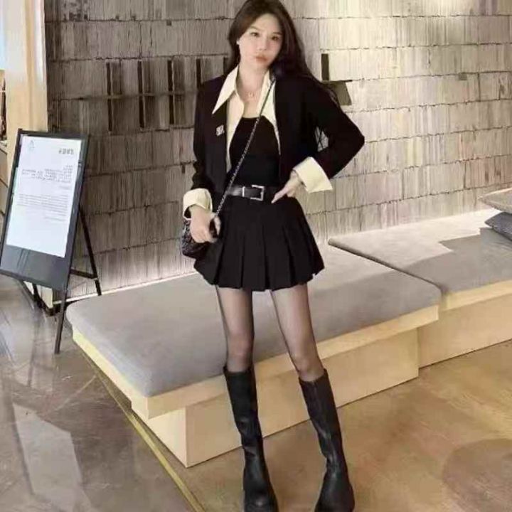全清价11.8设计感气质减龄假两件套西服学院风百褶裙短...