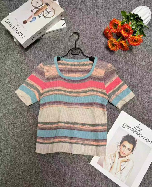 280件 夏季彩虹条纹方领甜辣妹修身显瘦短款针织上衣,单款,高弹力,独立包装 5.9 清