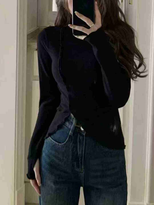 秋冬装螺纹德绒半高领T恤女设计感木耳边修身不规则百搭打底衫上衣潮,整款2色,面料软糯,弹力超大,独立包装,货品干净,1到4码,1150件左右,7.8清,分货加1