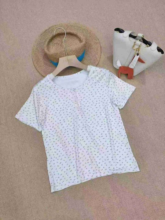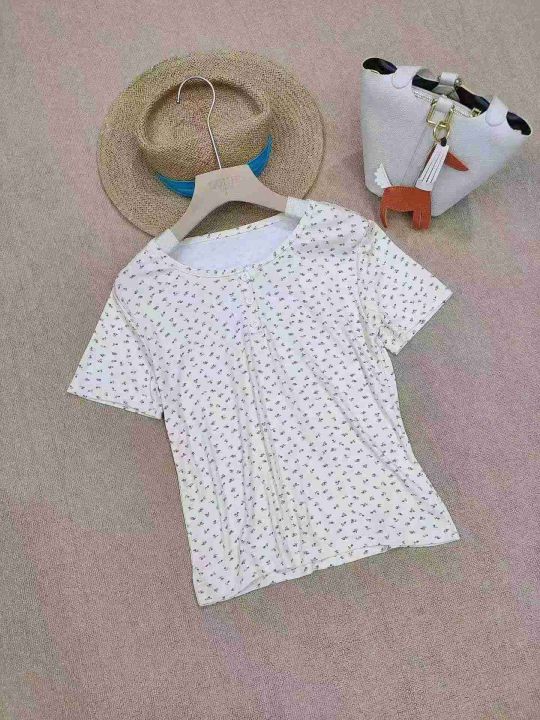 [月亮]:小清新碎花冰丝纽扣短袖辣妹上衣