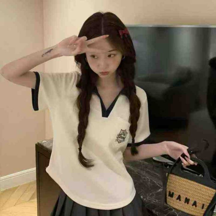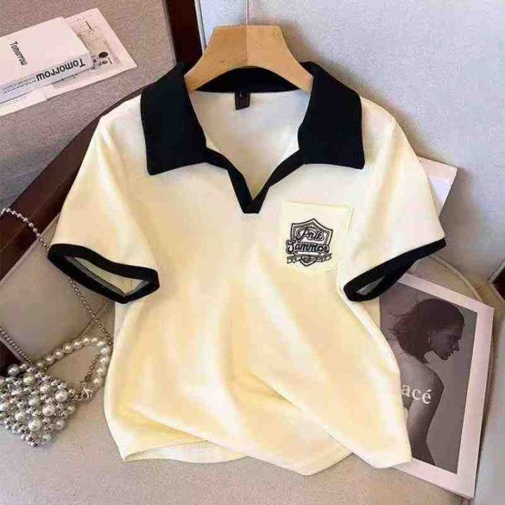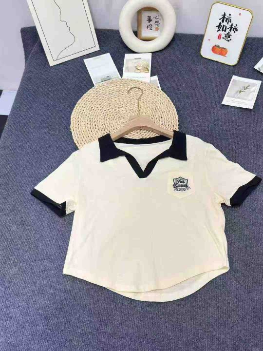 美式复古正肩polo衫撞色短袖棉t恤女夏宽松设计感小众别致短款上衣,数量260件,码数mlxl,独立包装,全清5.9元
