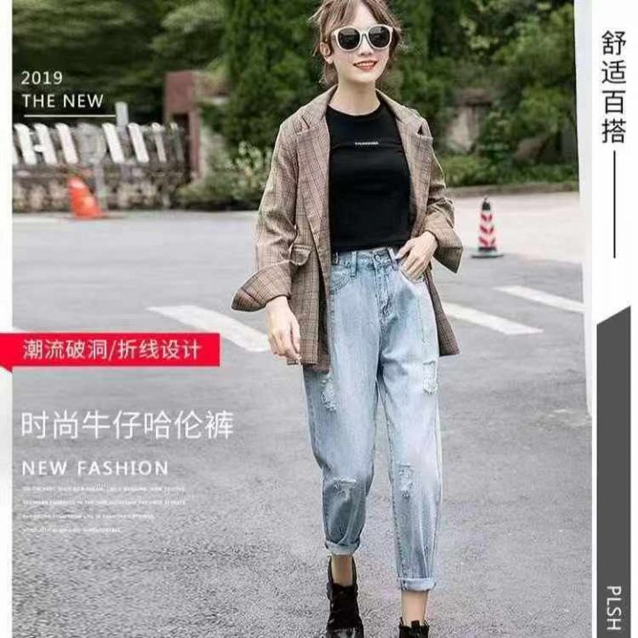 夏季破洞牛仔裤女宽松显瘦哈伦九分裤松紧腰大码老爹裤...