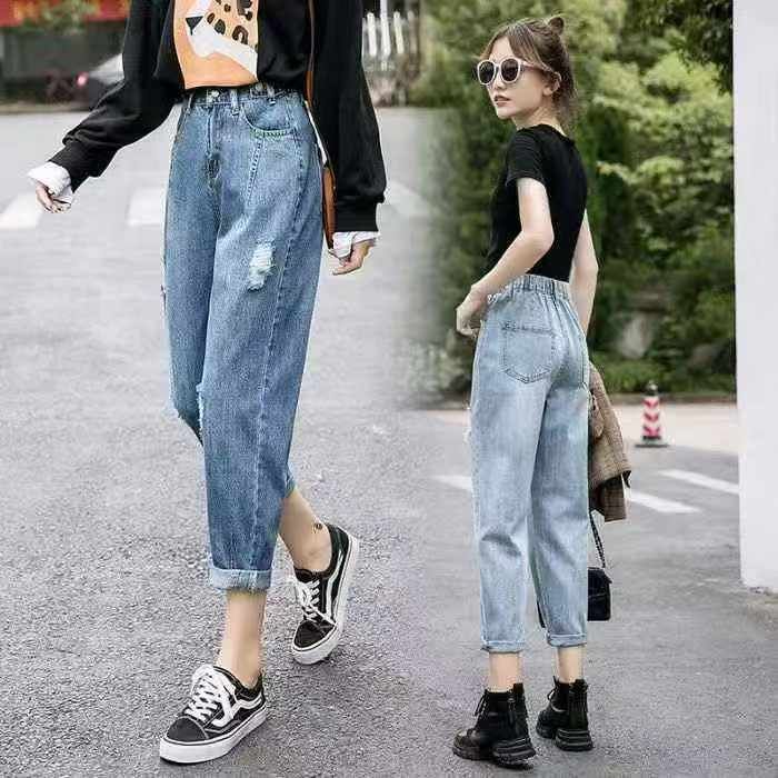 夏季破洞牛仔裤女宽松显瘦哈伦九分裤松紧腰大码老爹裤,数量330件,码数M-2XL,独立包装,全清11.8元