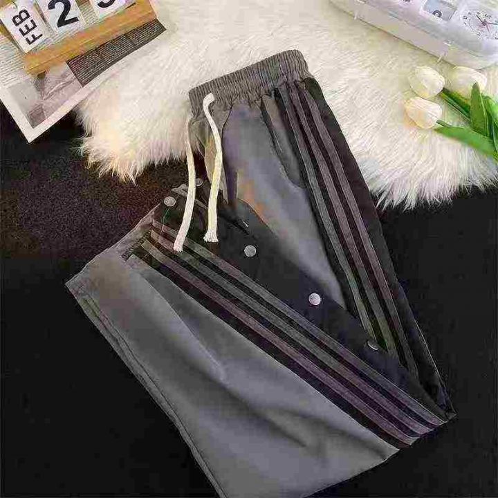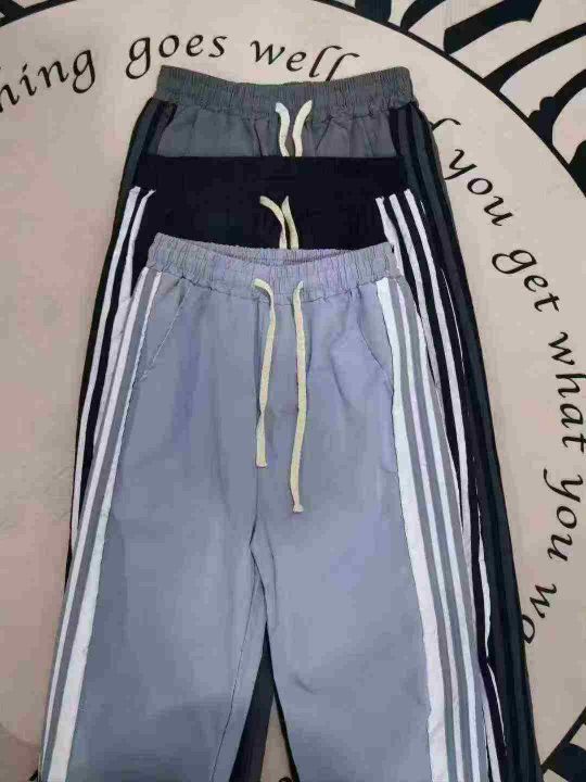 360件左右男款春夏侧边条纹排扣抽绳运动休闲裤,整款3色,码M-2XL,蓝色比例多,独立包装