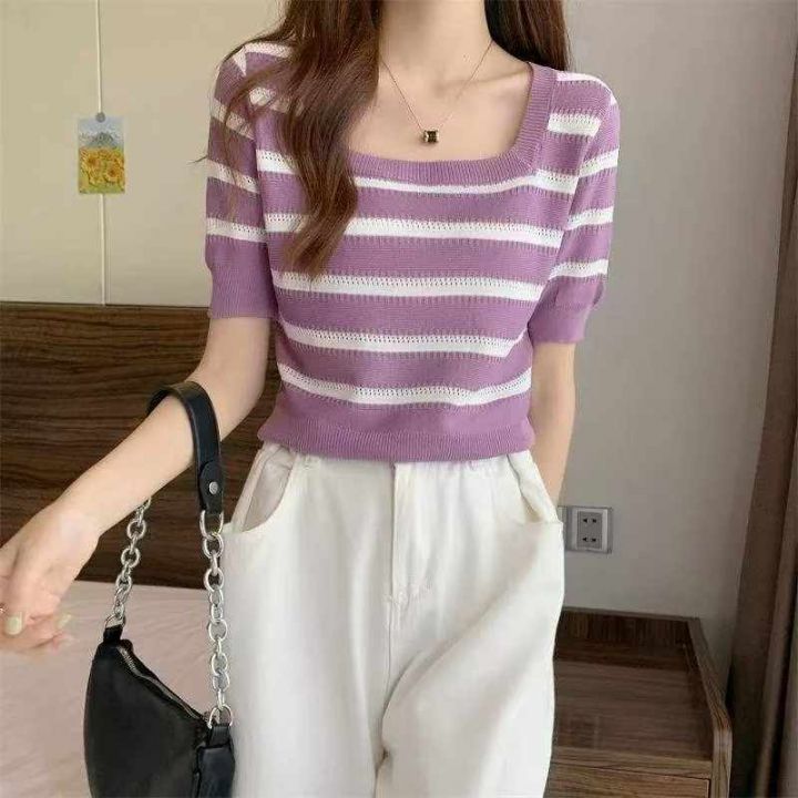 夏季新款撞色条纹韩系针织短袖T桖,独立包装,均码面料柔软舒适弹力大,单...