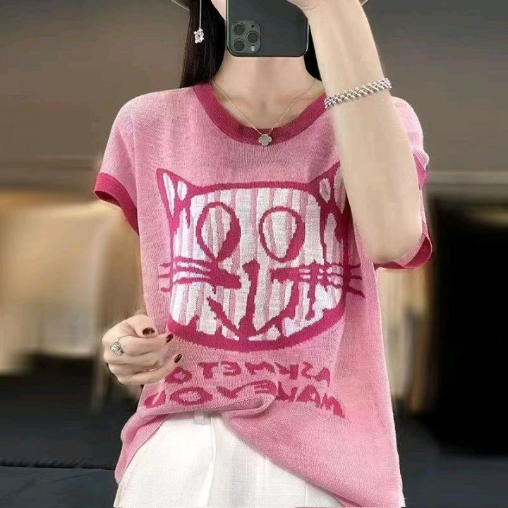 夏季新款时尚设计感拼色猫咪提花宽松慵懒风显瘦落肩针...