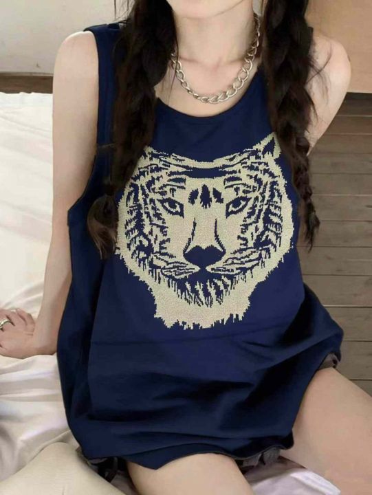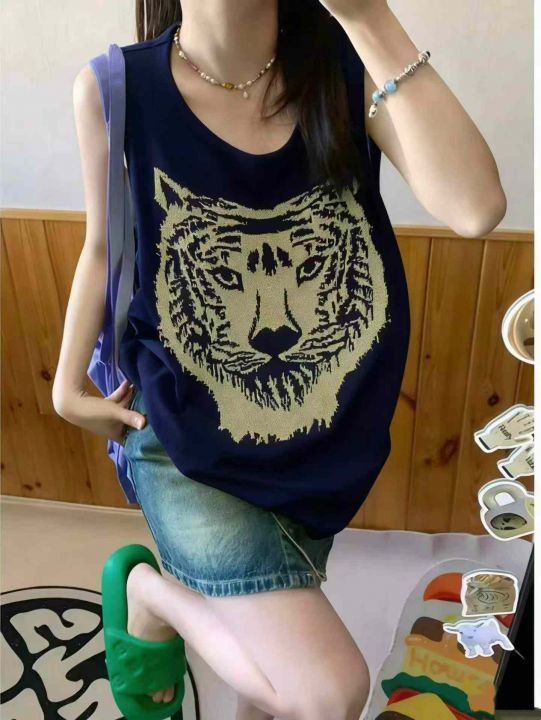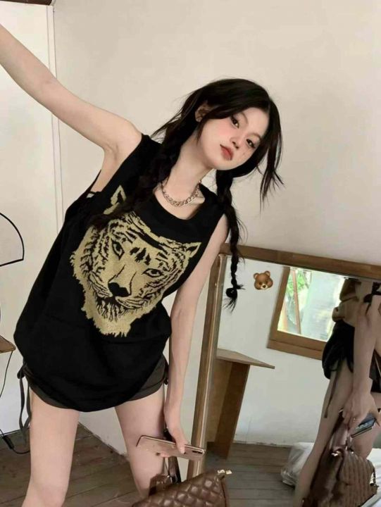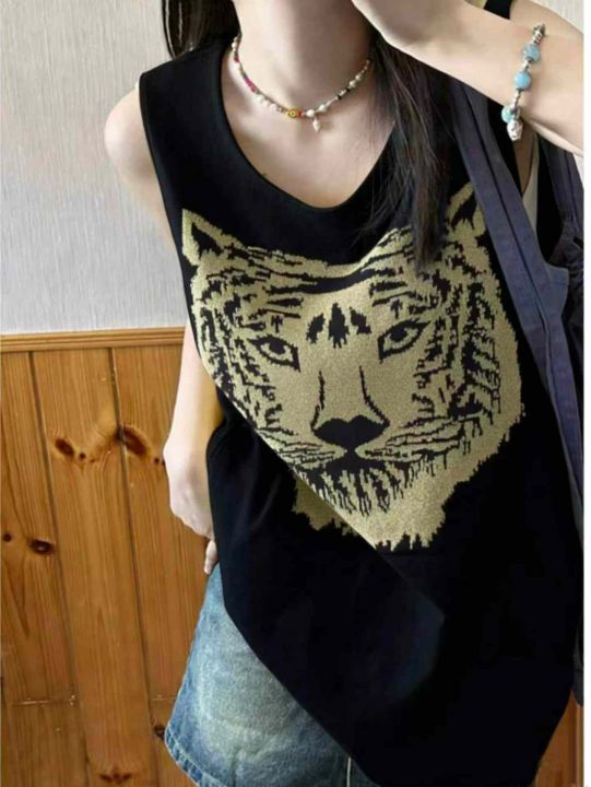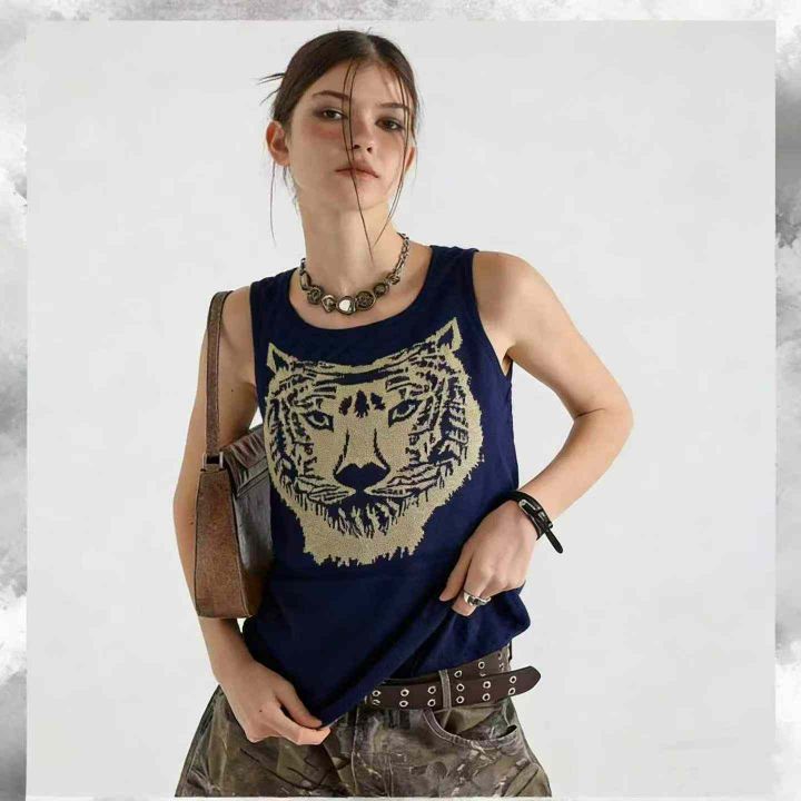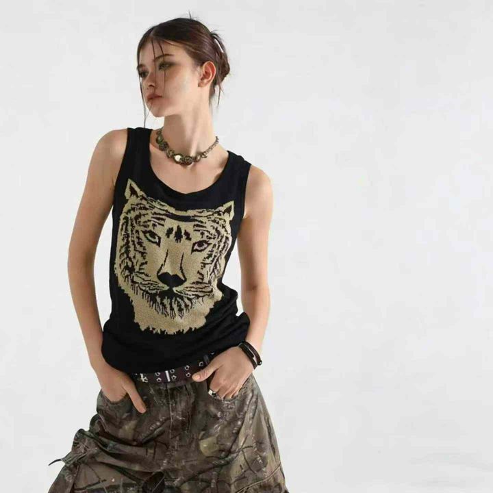 美式复古辣妹朋克摇滚亚文化针织背心上衣,虎头图案26...