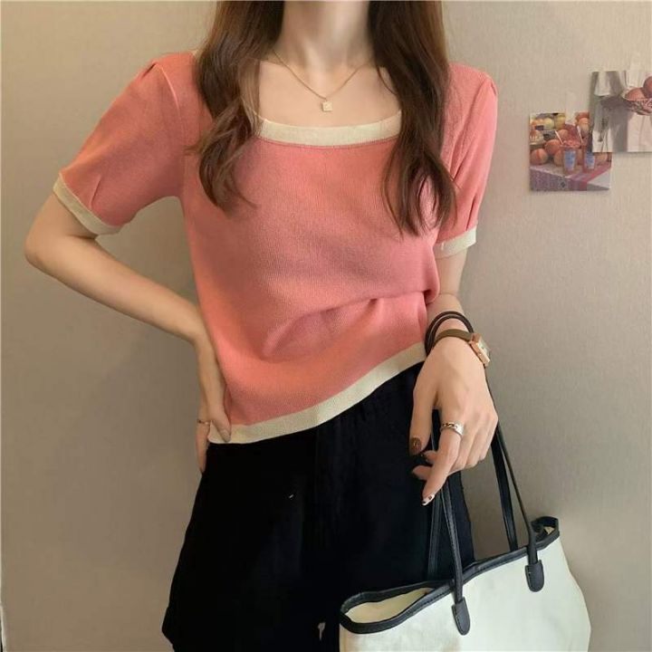 夏季新款大码宽松弹力显瘦方领冰丝针织短袖,独立包装,均码面料柔软舒适弹力,宽松版,单款3色米色黑色多,5300件,全清5.9元超低价秒杀!分货加一!