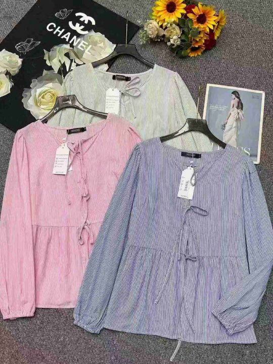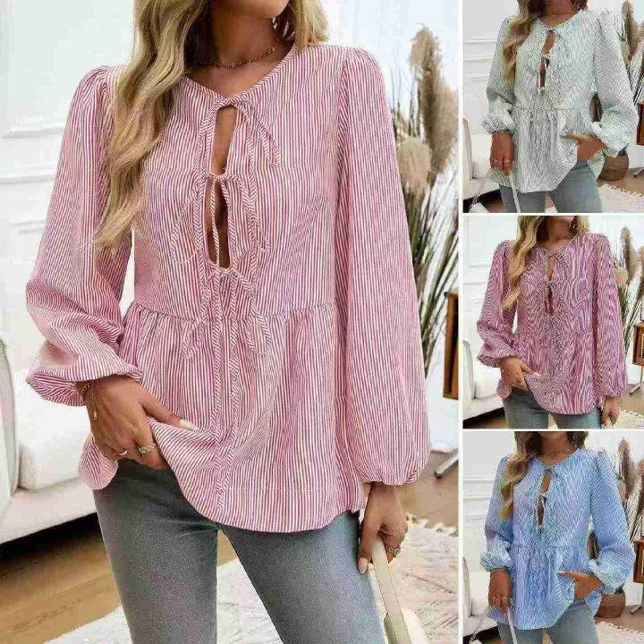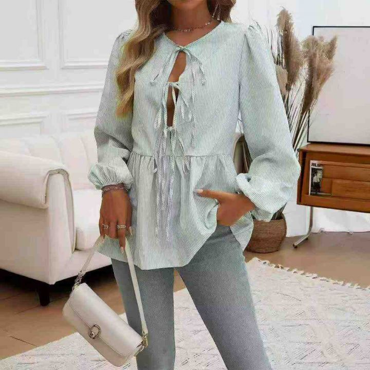 春夏季新款品牌原单欧美跨境女装时尚蝴蝶结棉麻绑绳条纹衬衣,独立包装带吊牌,码数S--L码,199件,全清6.9元超低价秒杀!