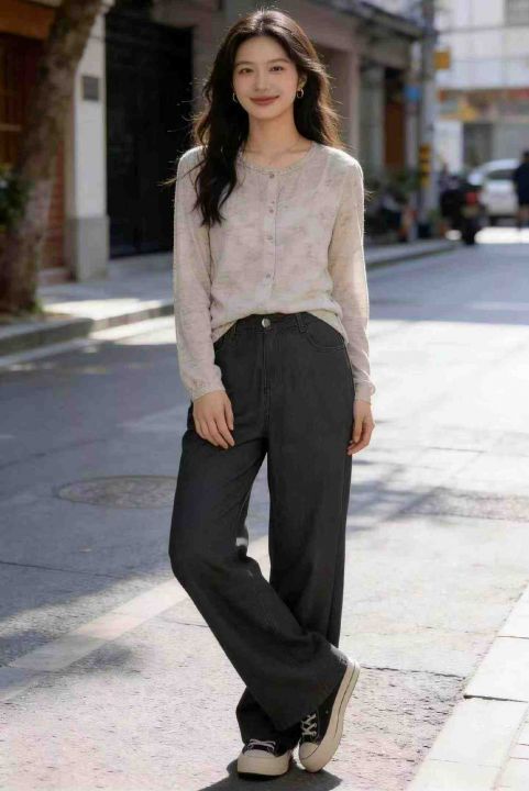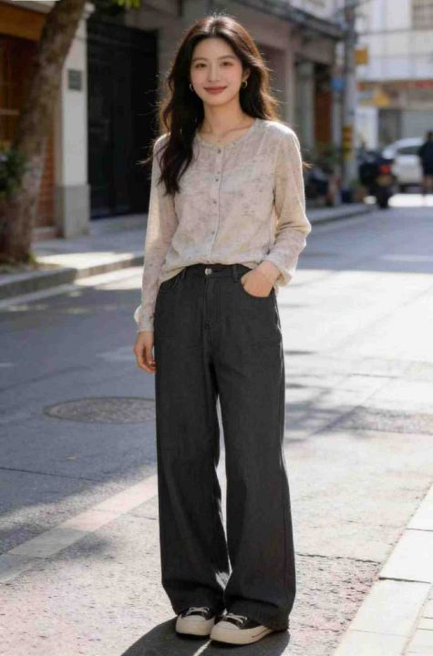 春秋新款复古高腰宽松直筒阔腿牛仔裤,独立包装,码数...