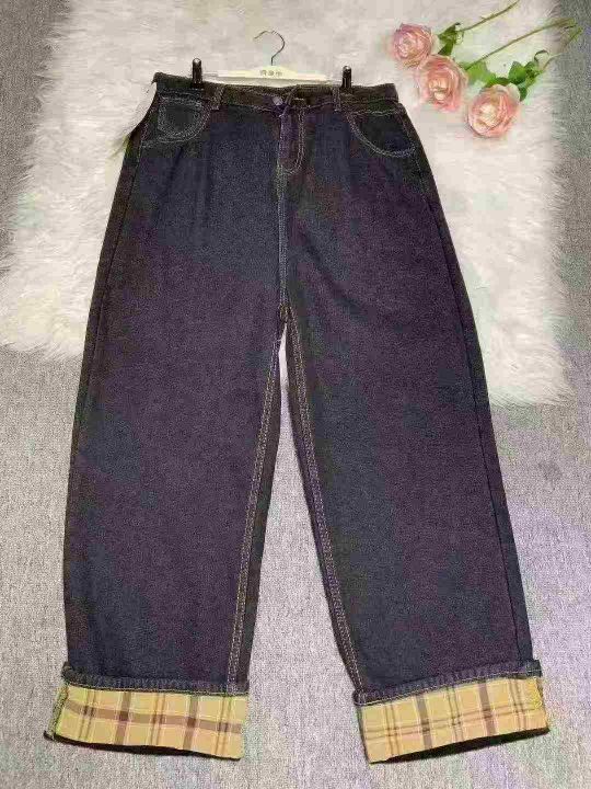 秋冬复古加绒加厚宽松显瘦牛仔裤女大码胖mm高腰直筒翻边阔腿长裤180件,独立包装带吊牌,尺码S~5XL全清福利价9.5