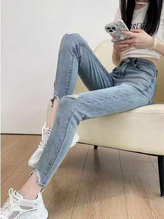春夏季新款高弹力网红复古洗水棉破洞9分牛仔小脚裤,...