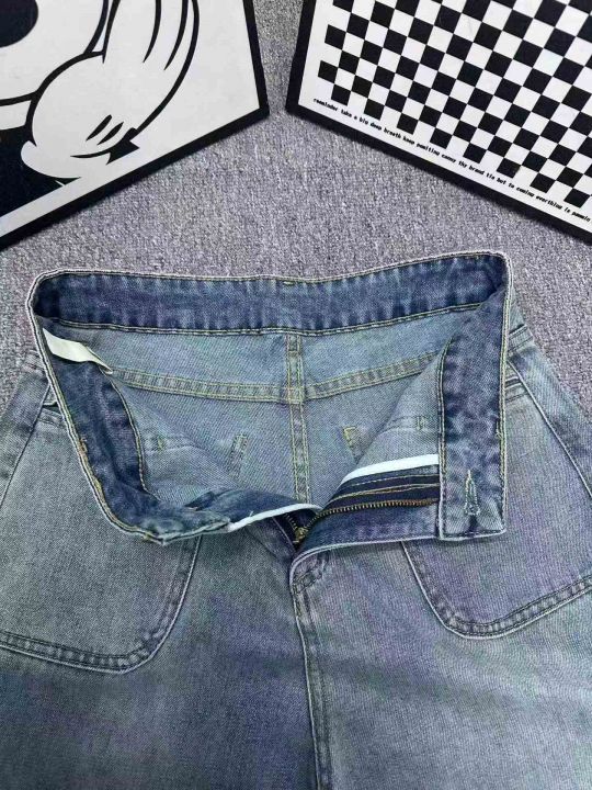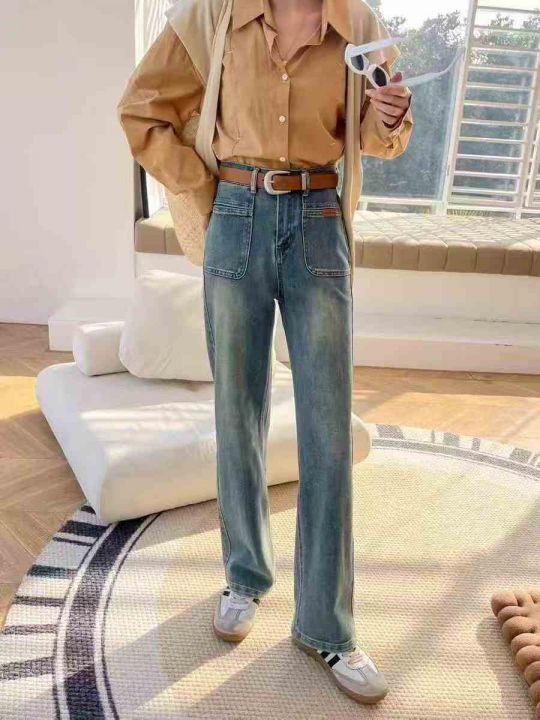 新款时尚百搭双口袋带皮标直筒牛仔阔腿裤,单款两色,...
