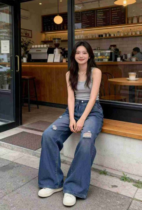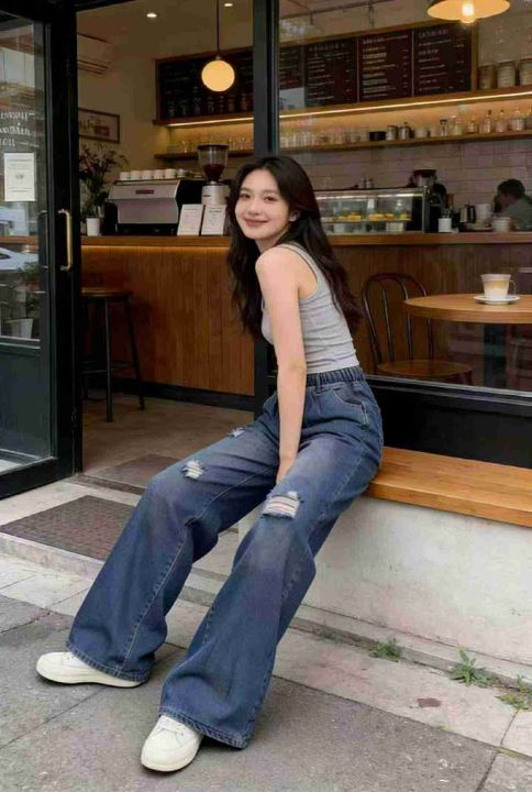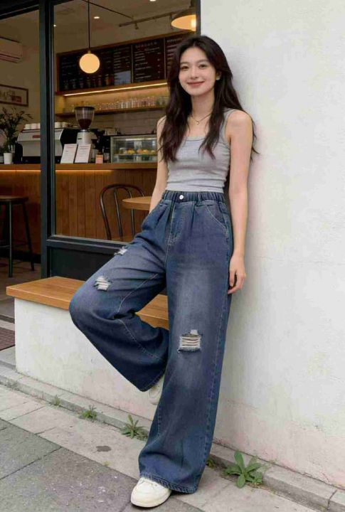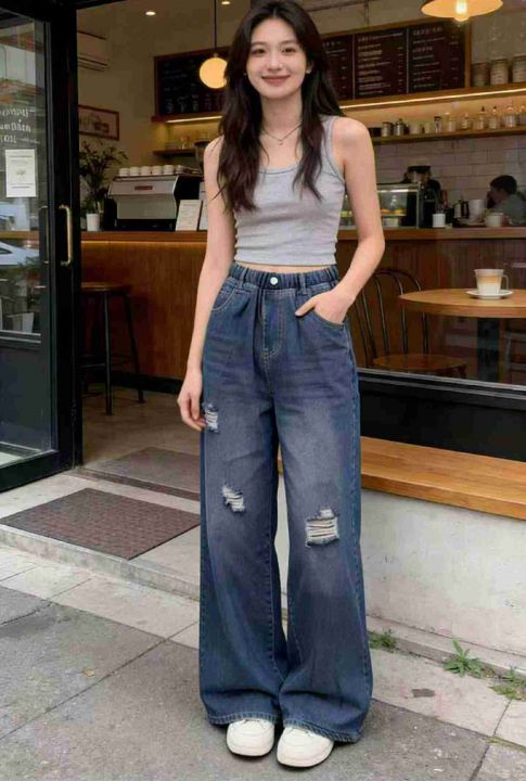 春季新款网红复古松紧腰破洞设计款牛仔直筒阔腿裤,独...