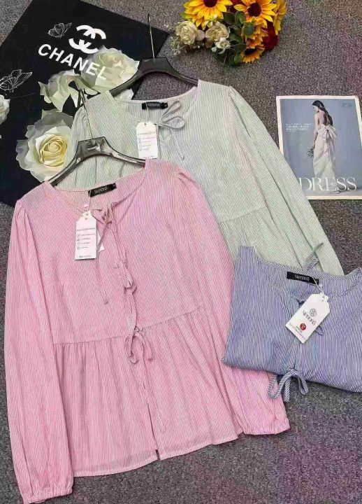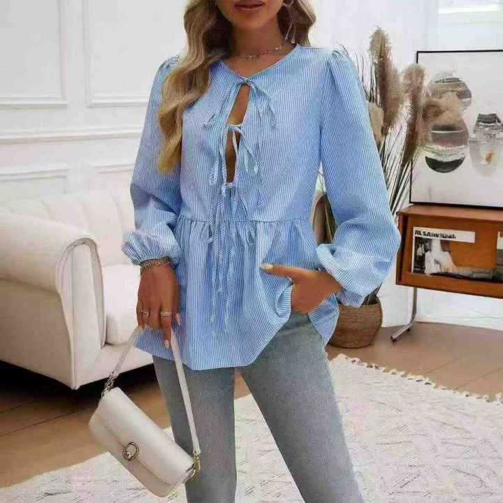春夏季新款品牌原单欧美跨境女装时尚蝴蝶结棉麻绑绳条纹衬衣,独立包装带吊牌,码数S--L码,199件,全清6.9元超低价秒杀!